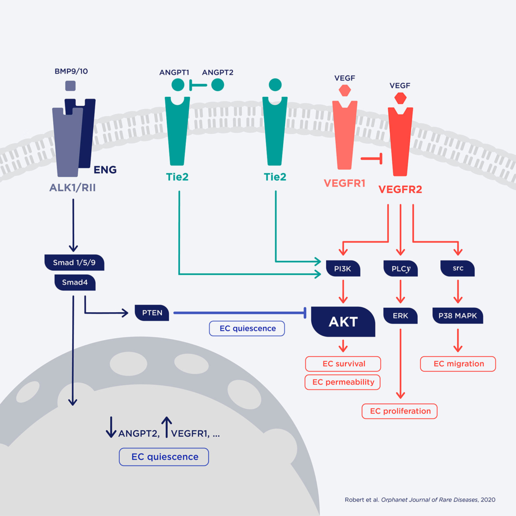 Additionally, this pathway also plays a central role in genetic disorders such as Hereditary Hemorrhagic Telangiectasia (HHT), a disease marked by abnormal blood vessel formation that leads to severe nosebleeds, chronic anemia, organ damage, and a significantly reduced lifespan. Currently, there are no approved therapies for patients with HHT.