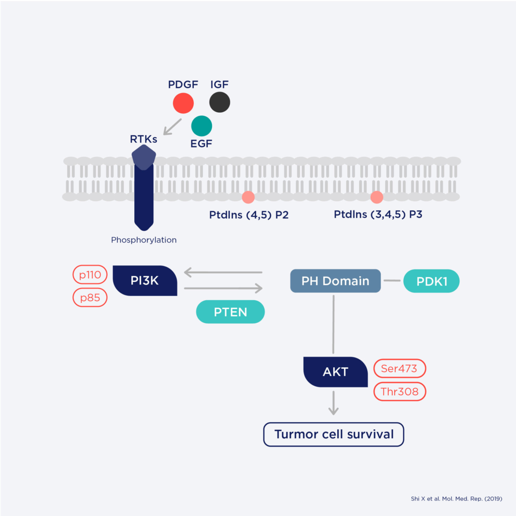 Genetic alterations in PIK3CA, AKT1 or PTEN can drive uncontrolled cell proliferation, leading to cancer. AKT, a central protein in this signaling pathway, sits downstream of both PI3K and PTEN.